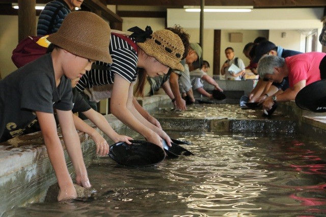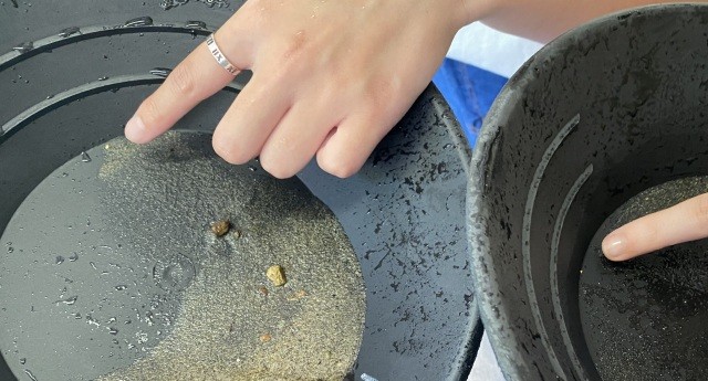 初めての砂金採りでもスタッフが優しく教えてくれるので安心です!もちろん採った砂金はお持ち帰りいただけます!