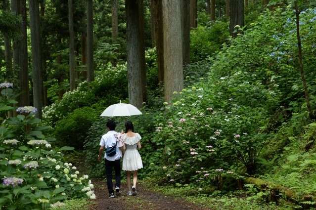 みちのくあじさいえん「みちのくあじさい園」は、園主の伊藤さんがスギ林にアジサイを植えたのが始まりです。今では東京ドーム3個分以上の広さのスギ林に囲まれた散策路の両側に約400種4万株が咲き誇っています。