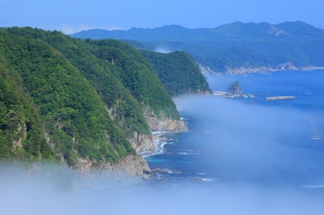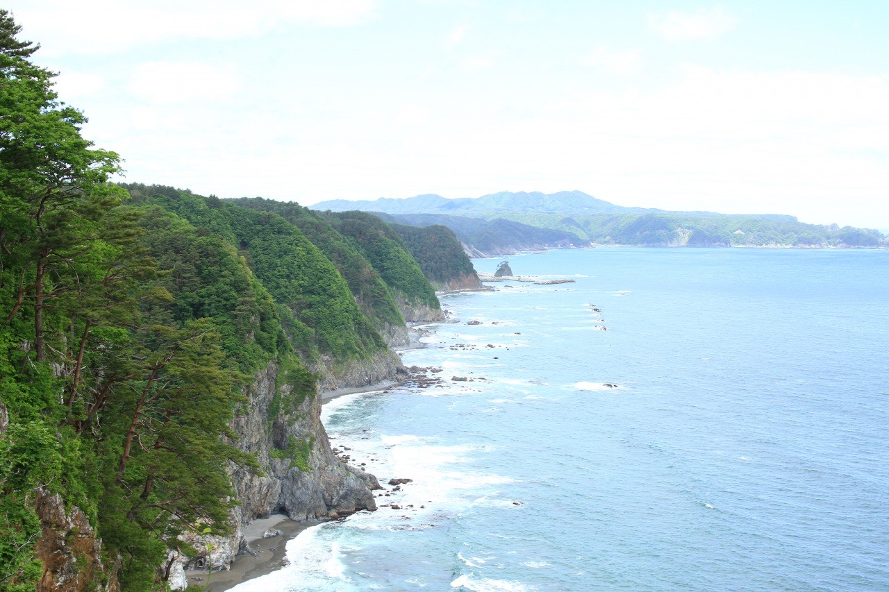 うのすだんがい田野畑村の南の海岸にあり、圧倒的な高さの断崖絶壁が特徴です。「鵜の巣断崖」の名前は、崖の中腹にウミウの巣があることに由来します。駐車場から続く松林の遊歩道は、ウッドチップが敷き詰められたふかふかの道。ゆったりとした雰囲気が好評です。500mほど先にある展望台から北を望めば、弓状にえぐられた高さ200mもの断崖が、屏風のように5列に連なる様を眺望できます。夏は涼やかな緑、秋には鮮やかに紅葉します。眼下の海は、エメラルド色もたたえるマリンブルー。白い波打ち際まで眺めることができ、旅人を魅了します。