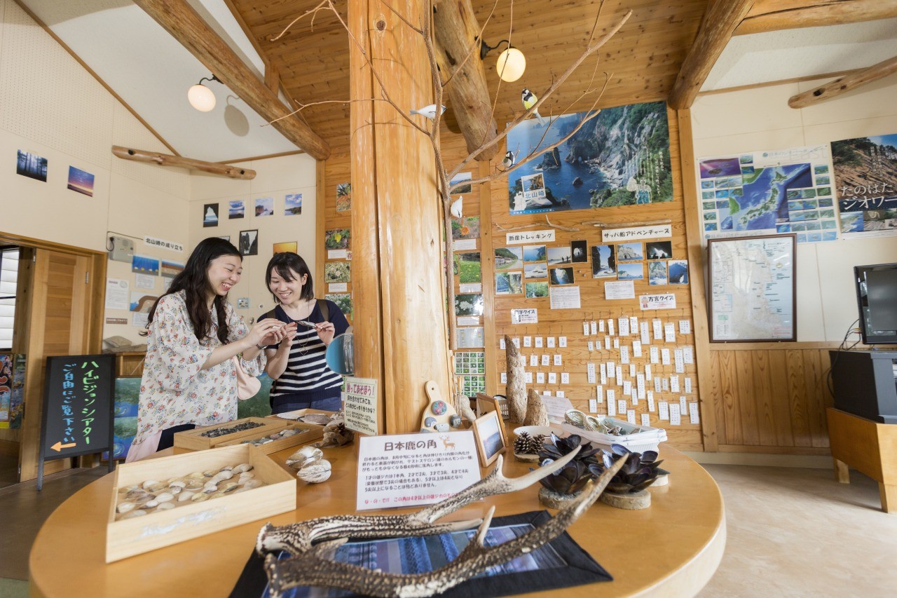 きたやまざきびじたーせんたー北山崎ビジターセンターは、駐車場から第一展望台に向かう途中、高台にあるログハウス調の建物。館内には北山崎の四季を紹介する無料のハイビジョンシアターや動植物に関する展示があり、天候の悪い日でも十分に楽しめます。館内のスタッフは、観光の案内はもちろんサッパ船やネイチャーガイドの手配もしてくれますので、お気軽に声を掛けてください。