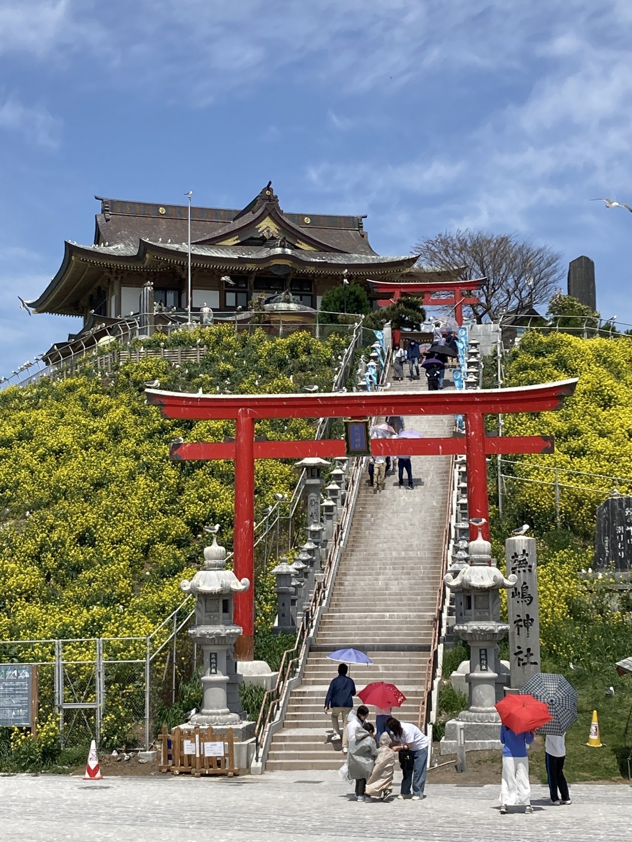 5月中旬には島に菜の花が咲き乱れ、菜の花の黄色、蕪嶋神社の鳥居の赤、白いウミネコと青空のコントラストが作る美しい光景を見ることができます。