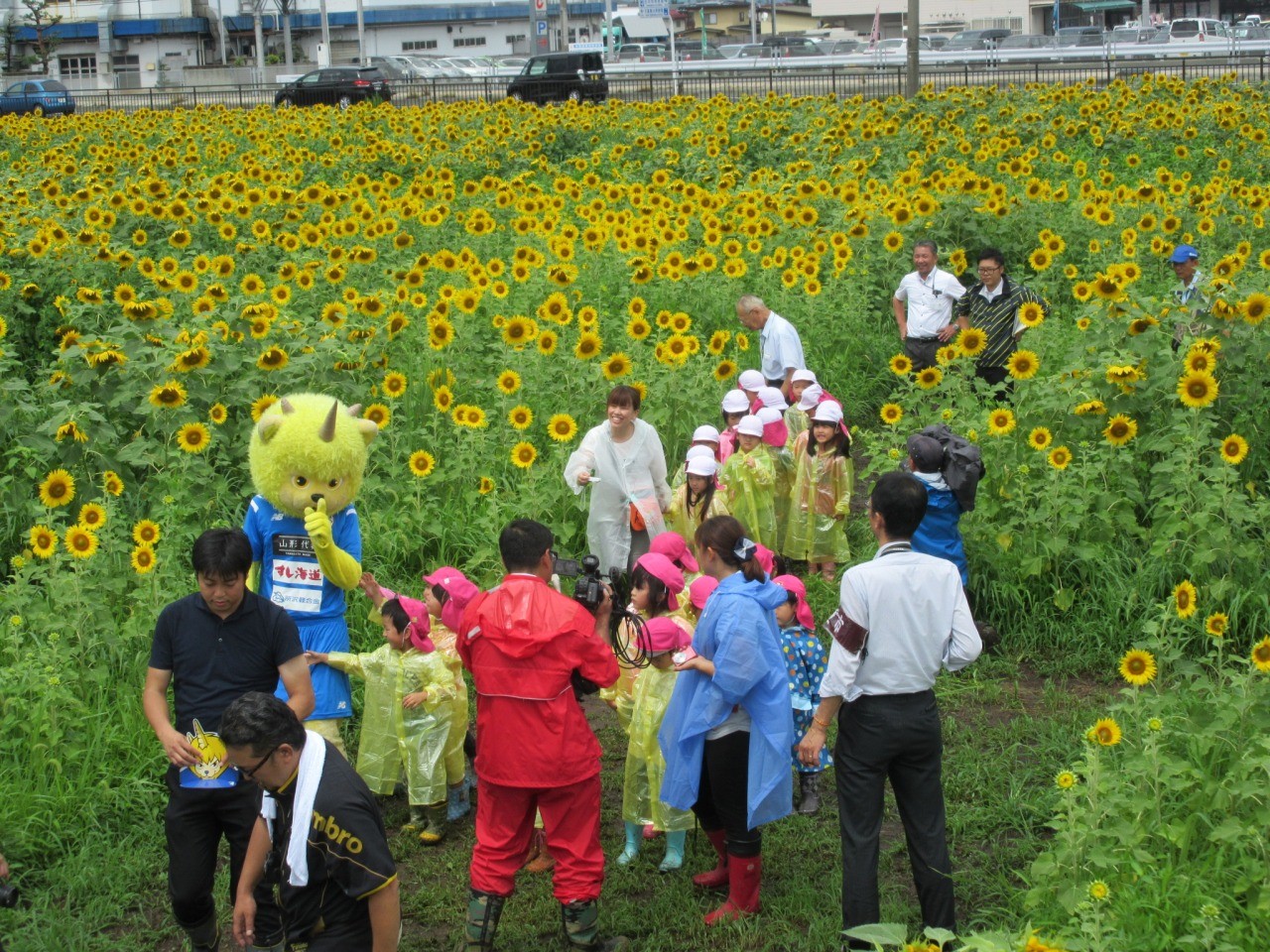 ひまわりめいろたくさんのひまわりが咲き誇る、巨大な迷路!50アールの敷地に約5万本のひまわりが咲き誇り、総延長約500メートルの迷路を楽しむことができます。このひまわり迷路は、干布地域づくり委員会が制作し、地元の干布小学校の児童たちが畑を耕し、種まきを行っています。地域の人たちの思いがこもったこのひまわり迷路は8月上旬まで見ることができます。