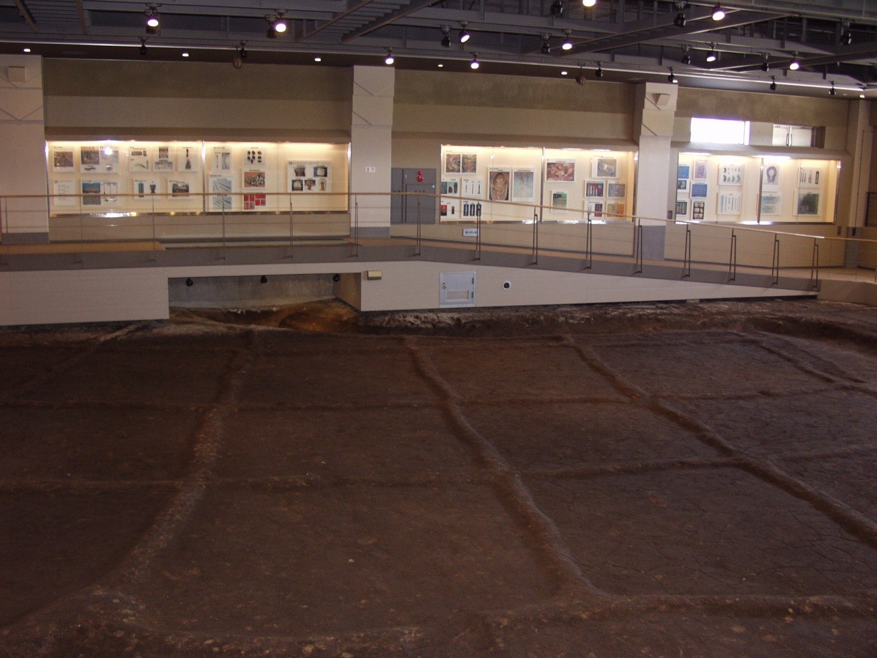 〇遺構露出展示室では高樋(3)遺跡の水田跡をそのまま展示しており、その一部を実際に歩くことができます。