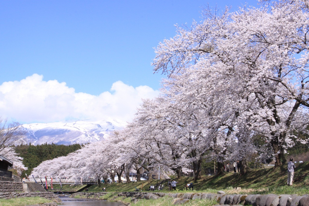 なかやまかせんこうえんのさくらなみき(やまがたけんゆざまち)鳥海山に源を発する洗沢川沿いにある桜並木。残雪で真っ白に輝く鳥海山を借景に、庄内ならではの黒瓦・白壁の建物の家並みに桜が映え、一枚の絵のような風景となっている。例年の見ごろは4月の中旬ごろ。