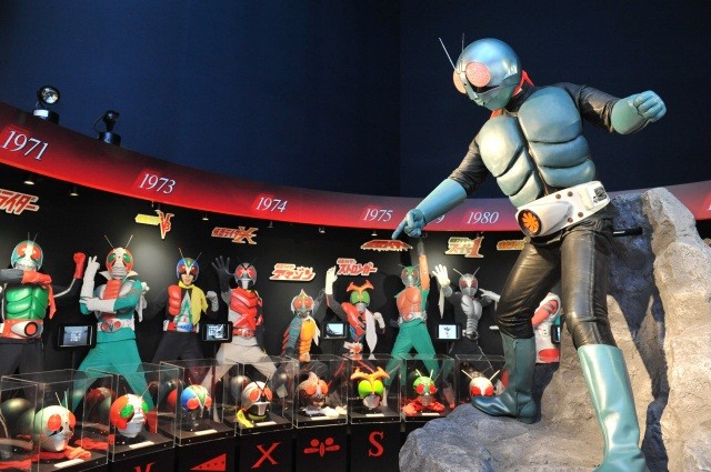 歴代仮面ライダーのマスクが並ぶ「仮面ライダーの世界」は、子どもだけでなく往年のライダーファンにとっても垂涎の空間。