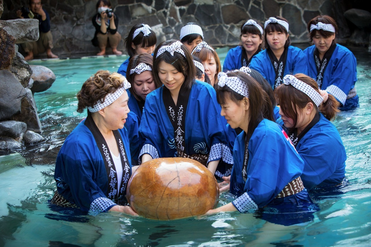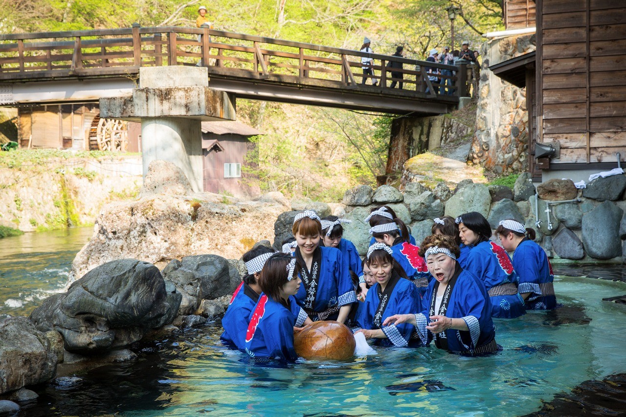 おおさわこんせいまつり大沢温泉敷地内にある仮宮にて欅(けやき)で出来たご神体をご祈祷。神楽や太鼓を奉納した後、露天風呂大沢の湯に移動し、ご神体を洗い清めます。そして、ご神体を露天風呂に浮かべ、祈願される女性たちが、ご神体にまたがって露天風呂内を回ります。
