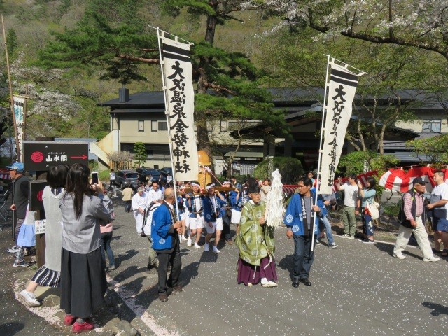 4月29日 神事 14:00~ その後神楽、金勢太鼓の奉納、紅白餅撒き【大沢温泉敷地内(自炊部・湯治屋への坂の途中)】
