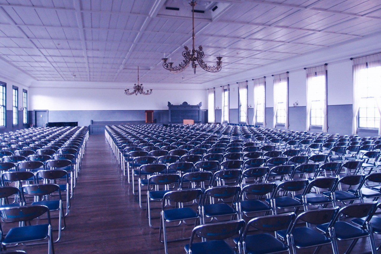 現在ではテレビや映画のロケ地、また結婚式の撮影としても利用される「画になる」建物であり、2つのシャンデリアがある講堂や、古い木製の机といすが並ぶ復元教室に自然光が入り込むと、まるでタイムスリップしたかのような雰囲気に包まれます。