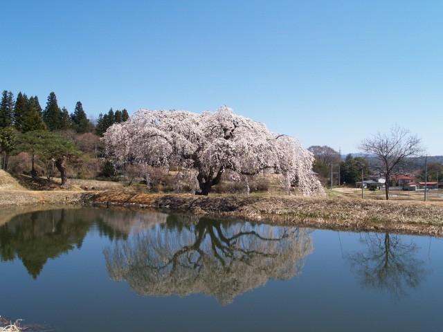 田園風景を背に池の水面に移る「逆さ桜」や、水郡線の車両とともに映る姿が人気の桜です。