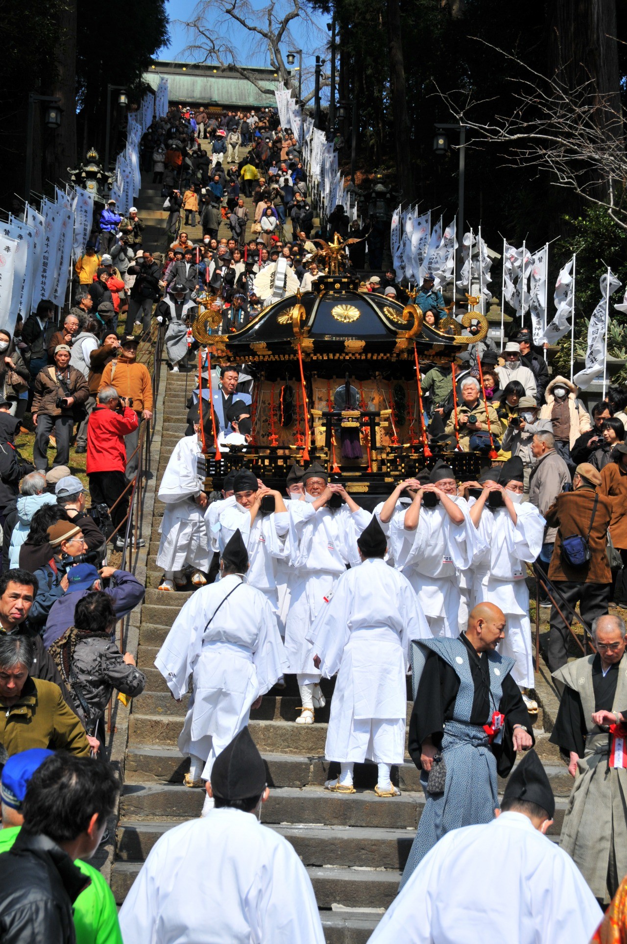 ほてまつり奥州一宮の鹽竈神社における早春の神事が、日本三大荒神輿と呼ばれる鹽竈神社帆手祭。元々は正月の神輿洗神事で、火伏祭として始まったものだが、後年海にゆかりのある「帆手祭」と呼ばれるようになり、現在で厄除け、繁栄も祈念して、神輿が市内を御神幸する。享保18年(1733年)から続く伝統あるまつりで毎年3月10日に行われている。最大の見所は、重さ1トンもの神輿が16名の担ぎ手によって、202段もの急な表参道(通称:男坂)を下りる様子である。その緊迫感は、参拝者も思わず息を呑むほど。お帰りの神輿が表参道を上がる様子も迫力満点。500人を超えるきらびやかなお供、稚児行列を従えた市内の御神幸など、港町塩竈が一日中活気にあふれ、市民にとっては、春の風物詩となっている。