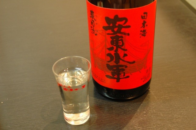 あんどうすいぐん(おざきしゅぞうかぶしきがいしゃ )日本海に沈む夕日をイメージした赤いラベルが、とても印象的な鰺ヶ沢の地酒「安東水軍」。