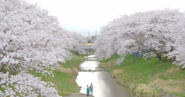 ふじたがわのふれあいさくらJR喜久田駅のそばにある藤田川堀之内橋を中心に、川の両岸3㎞にわたってソメイヨシノが咲き誇る。桜の開花期間中は、ライトアップされ、水面に映る桜も美しい。