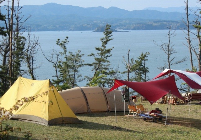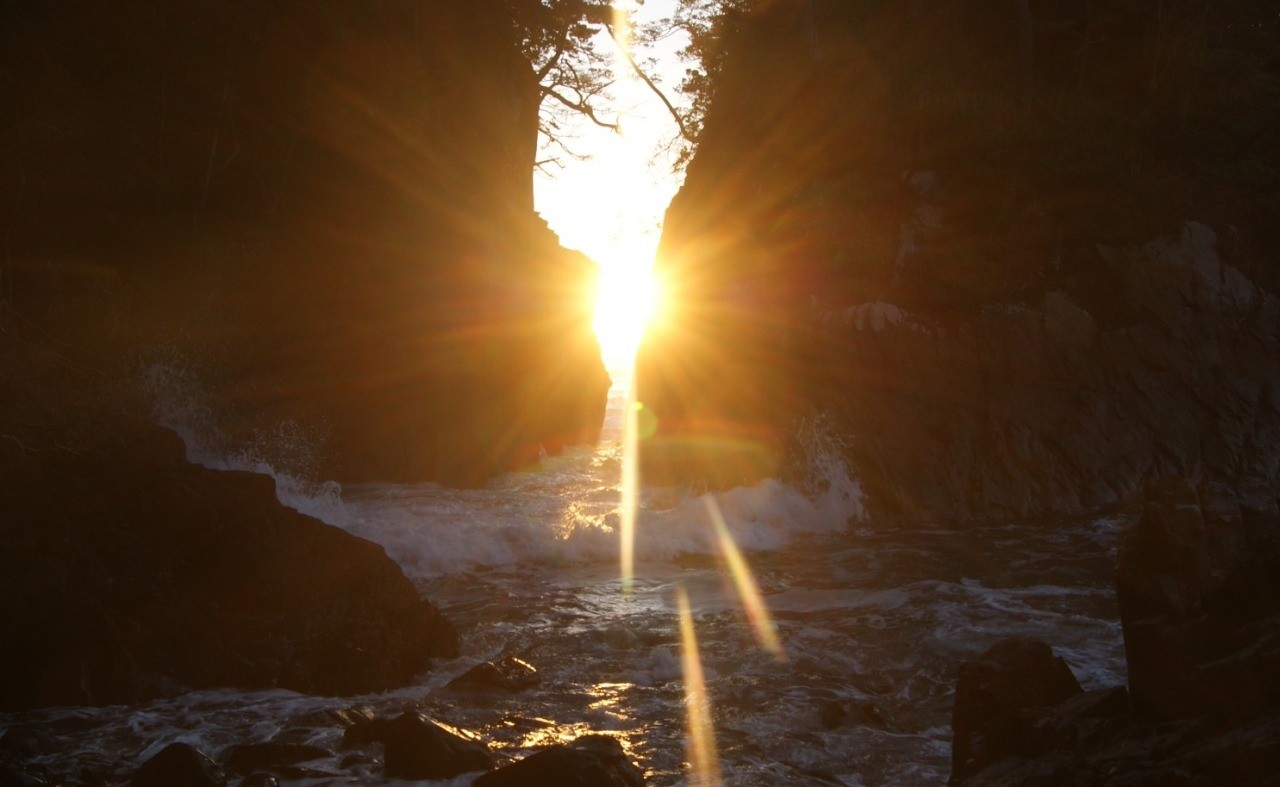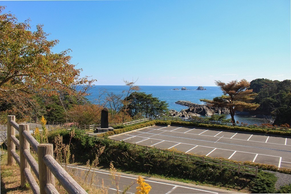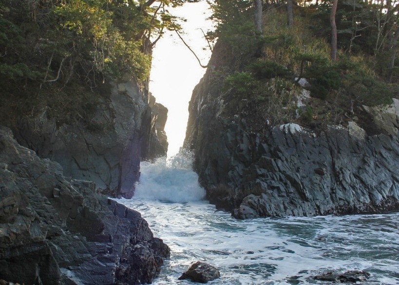 かみわりざき<みなみさんりくちょう>南三陸屈指の景勝地で、二つに割れた奇岩の間から荒波がしぶきを上げながら押し寄せる様子は迫力満点。全国の「白砂青松百選」に選ばれ、例年2月中旬と10月下旬頃には岩の間から登る日の出を望むことができます。岩場にはニッコウキスゲやハマギクなどが多くみられ、周辺には松林に囲まれた遊歩道やキャンプ場があり、森林浴をしながら海岸風景を楽しむこともできます。