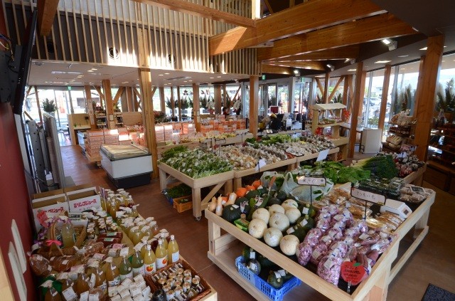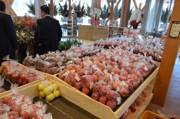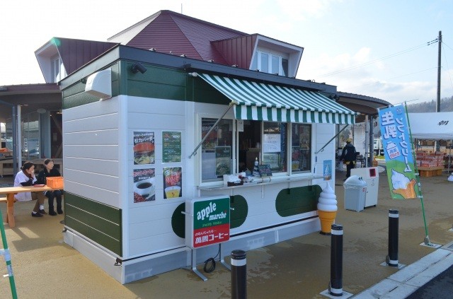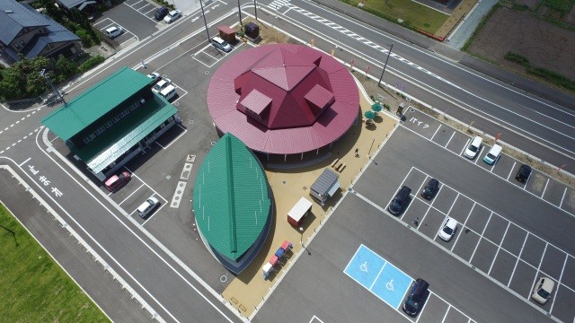 みちのえきあさひまち(りんごのもり)メインの販売施設棟は、町特産のりんごをイメージした赤い屋根が特徴です。上空から見るとりんごの実、隣接するトイレが葉の形をしています。一階にある産直スペースでは朝日町の農家さんが育てた旬な農産物やお菓子や農産加工品、工芸品など販売しております。軽食コーナーでは、りんごの果汁を麺に練りこみ、ほんのりとしたりんごの香りと、つるっとしたのど越しが特徴の朝日町特産「りんご冷麺」をお召し上がりいただけます。また、ほかではなかなか食べられないダチョウの肉を使った「ダチョウフランク」などがあります。外売場のアップルマルシェでは、朝日町産のりんごを使った「完熟りんごソフトクリーム」などがあります。