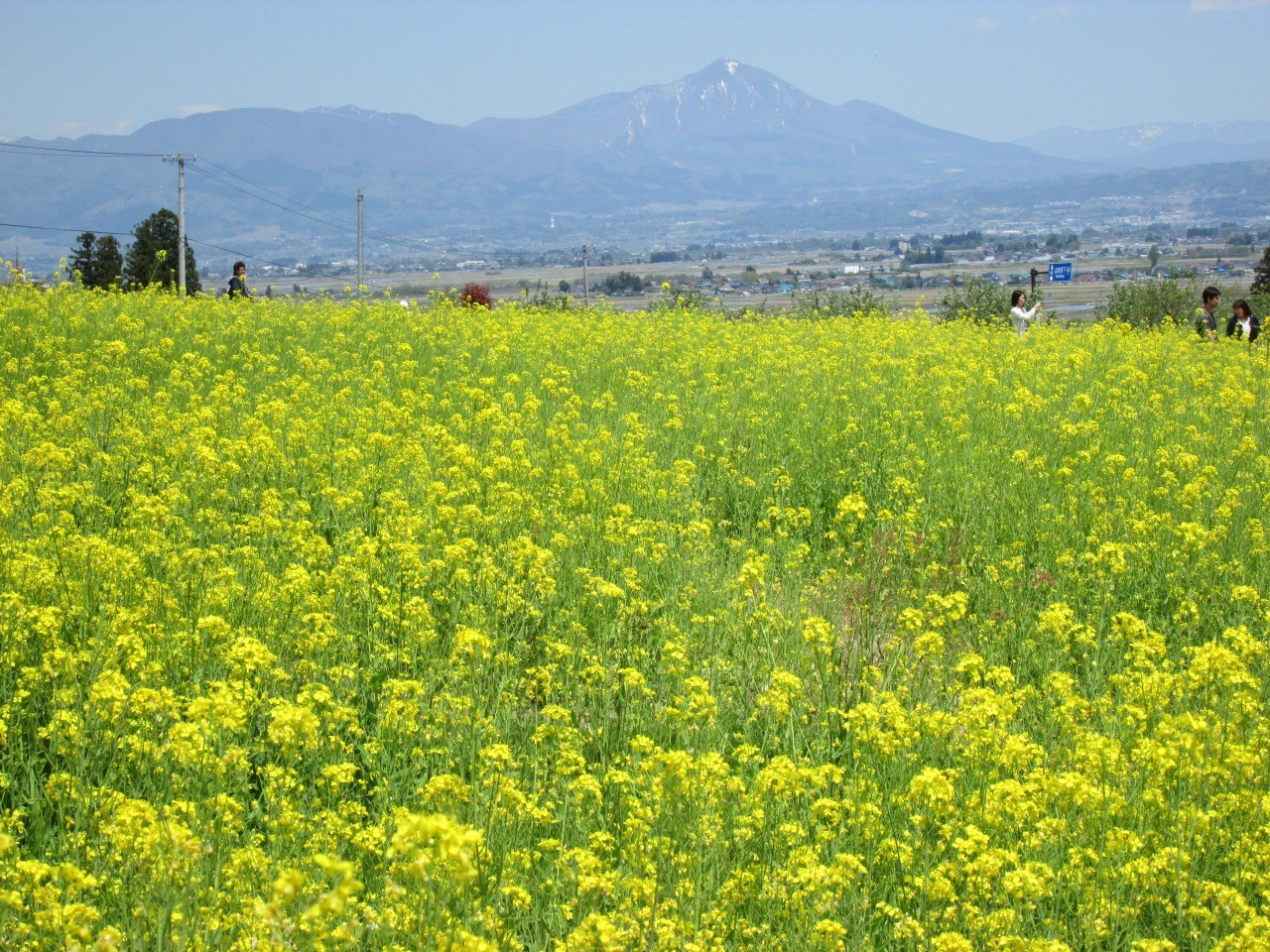 高台にある菜の花畑からは残雪の磐梯山を望むことができ、開花時期には菜の花を見に多くの人が訪れます。
