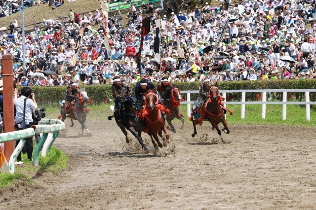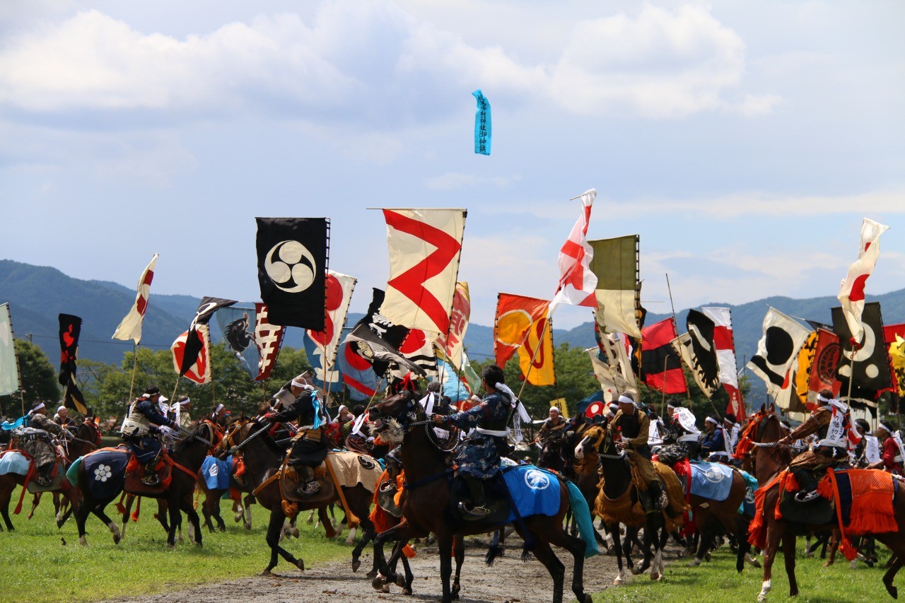 そうまのまおい相馬氏の祖といわれている平小次郎将門が一千有余年の昔、新しい軍事力として馬の活用を考え、下総国葛飾郡小金ヶ原(現在の千葉県北西部)に野馬を放ち、敵兵に見立て野馬を追い、馬を捕らえる軍事訓練として、また、捕らえた馬を神前に奉じ妙見の祭礼として行ったことが始まりと伝えられています。現在は7月末の土・日・月の3日間に相馬野馬追を開催し、約400騎の甲冑に身をかためた騎馬武者が腰に太刀、背に旗指物をつけて豪華絢爛で勇壮な戦国絵巻を繰り広げます。