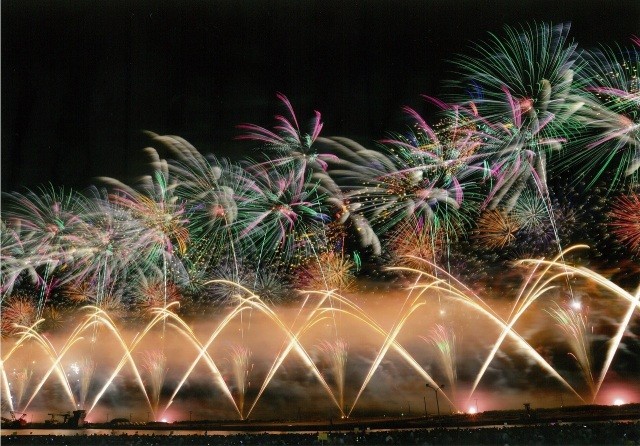 みなとまつりのしろのはなび(あきたけんのしろし)能代の花火は、約15,000発を音楽にのせて打ち上げるエンタメコンサート花火ショーです。