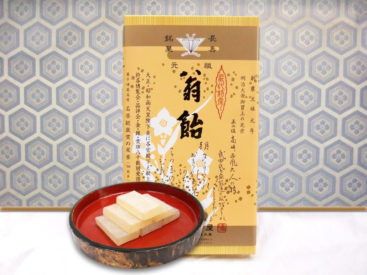 おきなあめ(あきたけんのしろし)翁飴の原料は、もち米と大麦。砂糖、添加物などは一切使用せず、自家製の麦芽糖化飴に特別な原料を配合して固形化します。