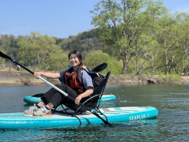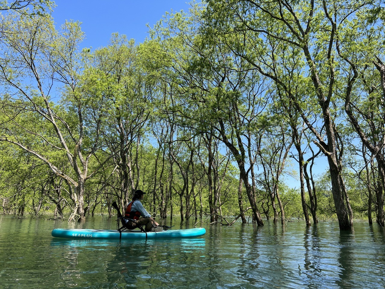 椅子が付いたSUP「チェアSUP」に座り、湖上で癒される新しい体験。 湖岸からではまず観ることができない、一番大きな水没林を中心に水の上に浮かぶ癒しとくつろぎの時間を楽しめます。 たくさん漕ぐのではなく、湖上でゆったりとした時間を過ごしたい方におすすめです!