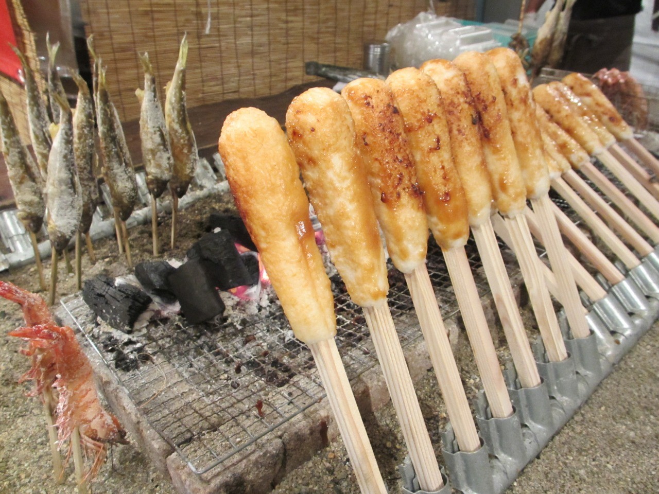 みそたんぽ(あきたけんせんぼくし)半練りにしたごはんを秋田杉の棒に巻きつけてから、味噌だれを塗って焼いたもの、