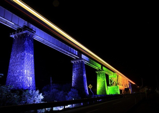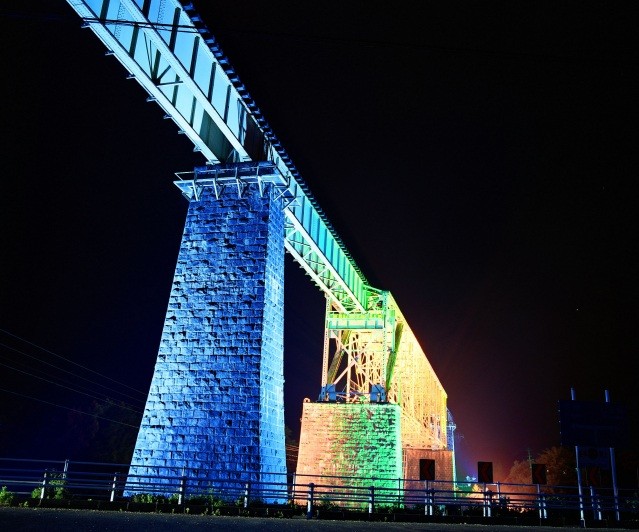 いちのときょうりょうらいとあっぷ完成当時「東洋一」の規模を誇ったJR磐越西線「一の戸橋梁」を青、緑、黄色の3色、16基でライトアップします。優美な一の戸橋梁が美しく浮かび、幻想的な景観を楽しめます。