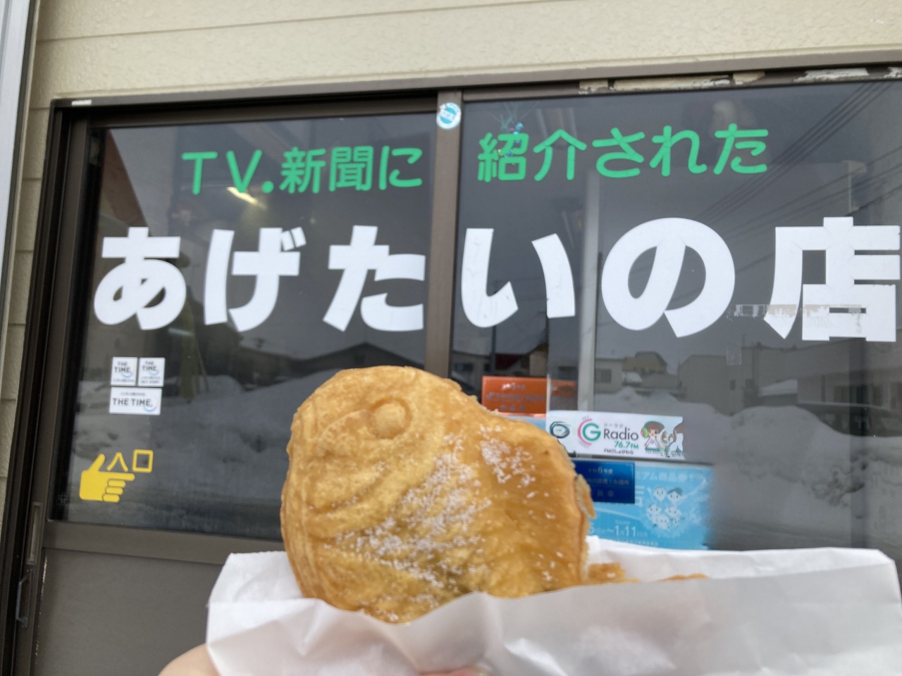 あげたい(あげたいのみせ みわや)「あげたい」は、一度焼いたたい焼きを油で揚げ、砂糖をまぶした五所川原名物として親しまれているお菓子です。