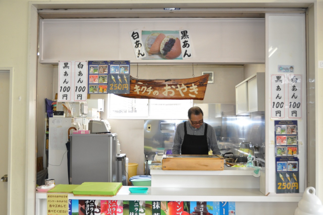 JR五所川原駅前の弘南バスターミナルで販売されている「キクチのおやき」は、生地がやや厚めで、あんがたっぷり詰まっているのが特徴です。黒あんと白あんの2種類があり、素朴でどこか懐かしい味わいが楽しめます。