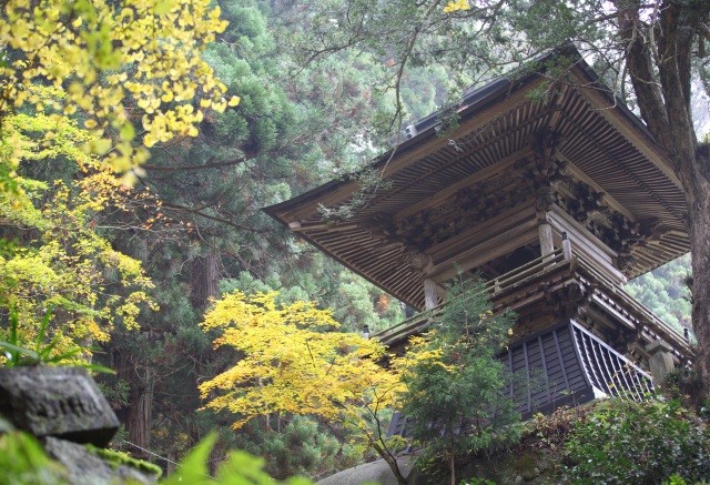 とうどうさん史跡名勝天然記念物に指定されている杉並木の表参道を抜けると、巨大な自然石の上に建つ東堂山鐘楼にたどり着きます。