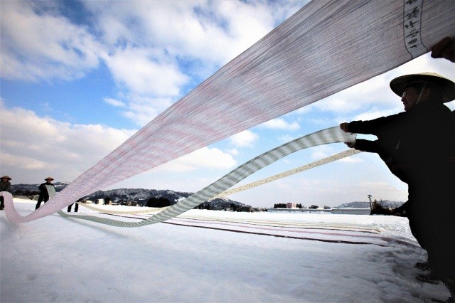 平織りの麻織物である「越後上布」に「しぼ」という小さなしわをつけた小千谷縮は、江戸時代から伝わる小千谷の特産品。織物作りの工程中、そばの茎を燃やして作った灰汁を糸の漂白のために用いたり、布海苔(ふのり)が糸に張りを持たせるための糊として用いられるなど、縮とへぎそばは互いに大切な存在なのです。