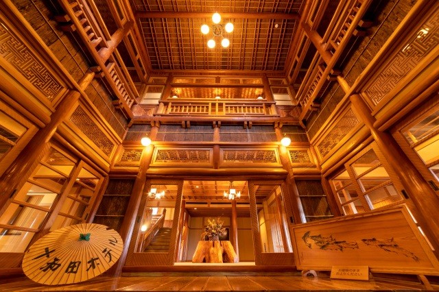 当時、秋田・青森・岩手の三県から宮大工80名を集めて技術を競わせたと伝えられており、各部屋の床の間、天井、格子戸などの意匠もひとつひとつ異なり、それぞれが違った趣と表情を見せています樹齢の長い杉材を主体とした建物本体は、年を重ねるごとに磨きがかかり、柱に使われている丸太はますます独特の光を放ち、訪れる人々に驚きと感動を与えています。