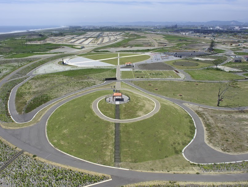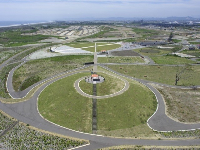 せんねんきぼうのおか「千年希望の丘」は、千年先の子どもたちが笑顔で幸せに暮らせるように、との願いが込められた復興の象徴であり、慰霊と震災伝承、防災教育の役割を担うメモリアルパークです。岩沼市の沿岸部、南北約10㎞に震災前の集落名(相野釜、藤曽根、二野倉、長谷釜、蒲崎、新浜)を残した6つの公園と、これらをつなぐ園路や関連施設があります。この丘は防災集団移転跡地に、市内の震災がれきの約90%にあたる約57万4千トンが再生資材として利用されてつくられました。これにより、海側から、防潮堤、千年希望の丘、貞山堀の護岸、かさ上げ道路(玉浦希望ライン)が整い、津波からの「多重防御」が完成しました。2013年からは、ボランティアの方々により21種の樹木約40万本の植樹が行われました。15~20年後には立派な「緑の堤防」が完成する予定です。