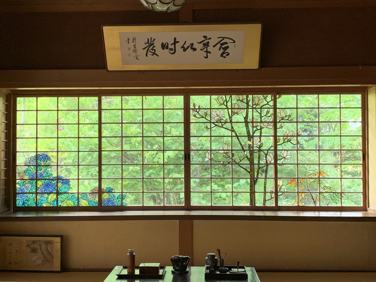 「詩夢庵」は建具や調度に贅が凝らされ、なかでも3か所の窓の装飾は、大金を投じてステンドグラス作家小川三知に依頼し、制作しております。