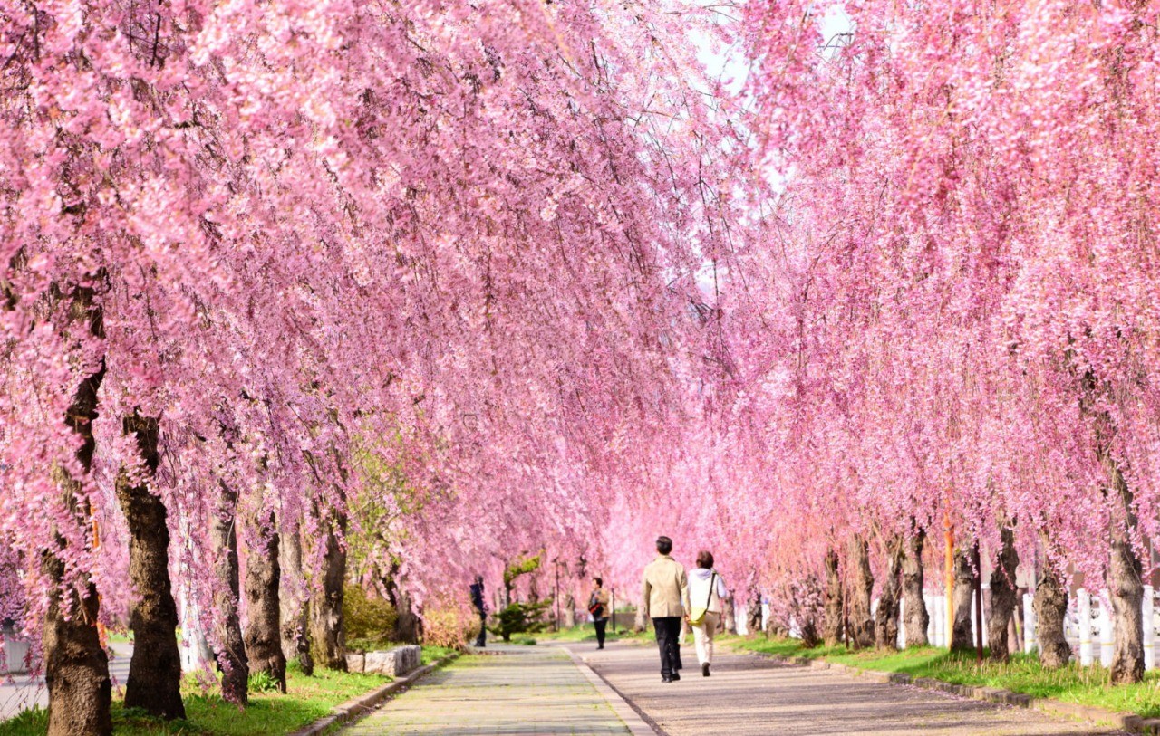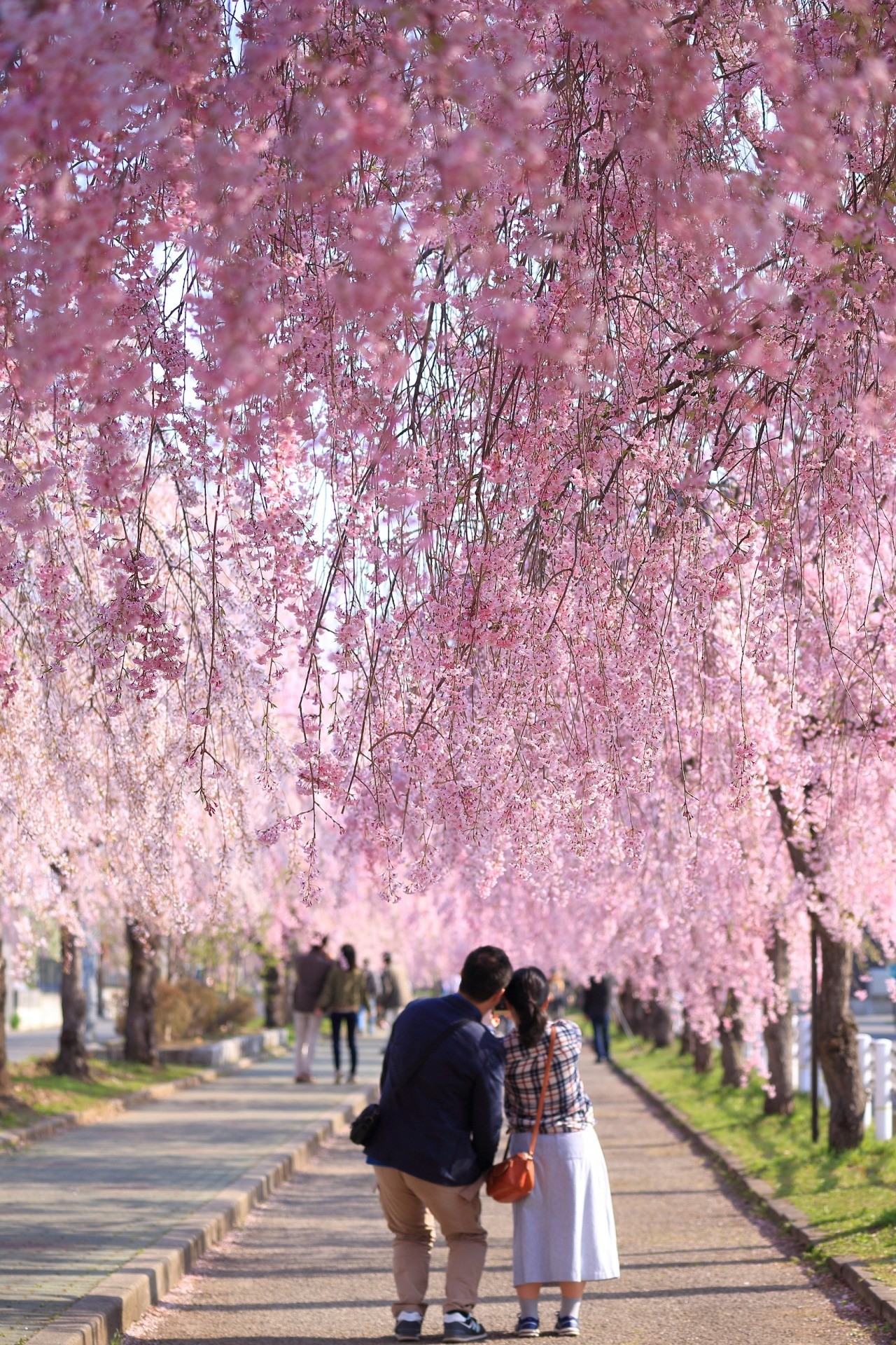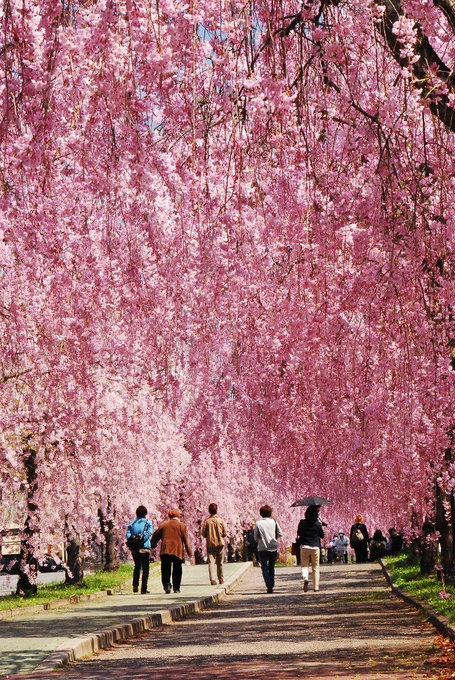 にっちゅうせんしだれざくらなみき昭和59年に廃線となった旧国鉄日中線跡地の一部を遊歩道として整備したもので、喜多方駅の西徒歩5分にある遊歩道入口から全長約3kmにわたって約1000本のしだれ桜が植栽されており、日本最大級のしだれ桜並木が楽しめます。また、道の中間地点には当時走っていたSLが展示されており、しだれ桜とのコラボレーションが楽しめます。桜のトンネルは絶好の撮影スポットです。