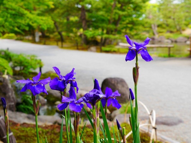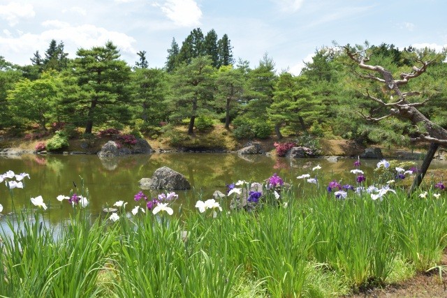 4月上旬にはサクラ、5月はシャクナゲ、アヤメ、続いてハナショウブ、秋には紅葉が庭園に彩りを添え、四季それぞれの顔を見せてくれる。