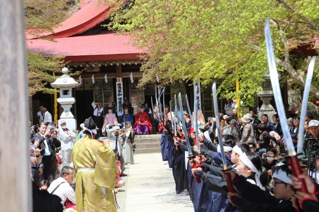 春の例大祭で奉納される剣舞「濫觴武楽」は、北畠顕家が多賀城から霊山城に入城した際、地元民が歓迎と武運長久の願いをこめて舞った剣舞が起源とされ、670年以上の伝統を持つ舞で、天空に太刀をかざし、勇壮に舞う姿は見る人を引きつけます。