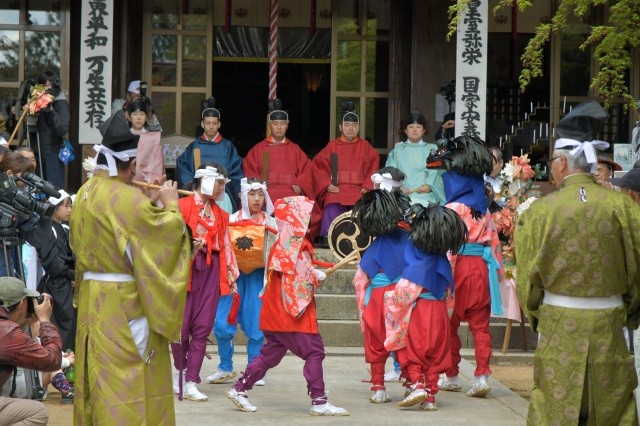 ■春季例大祭 開催日4月29日、神事のあとに神社参道で奉納される濫觴舞楽、北又の獅子舞や霊山太鼓なども奉納されます