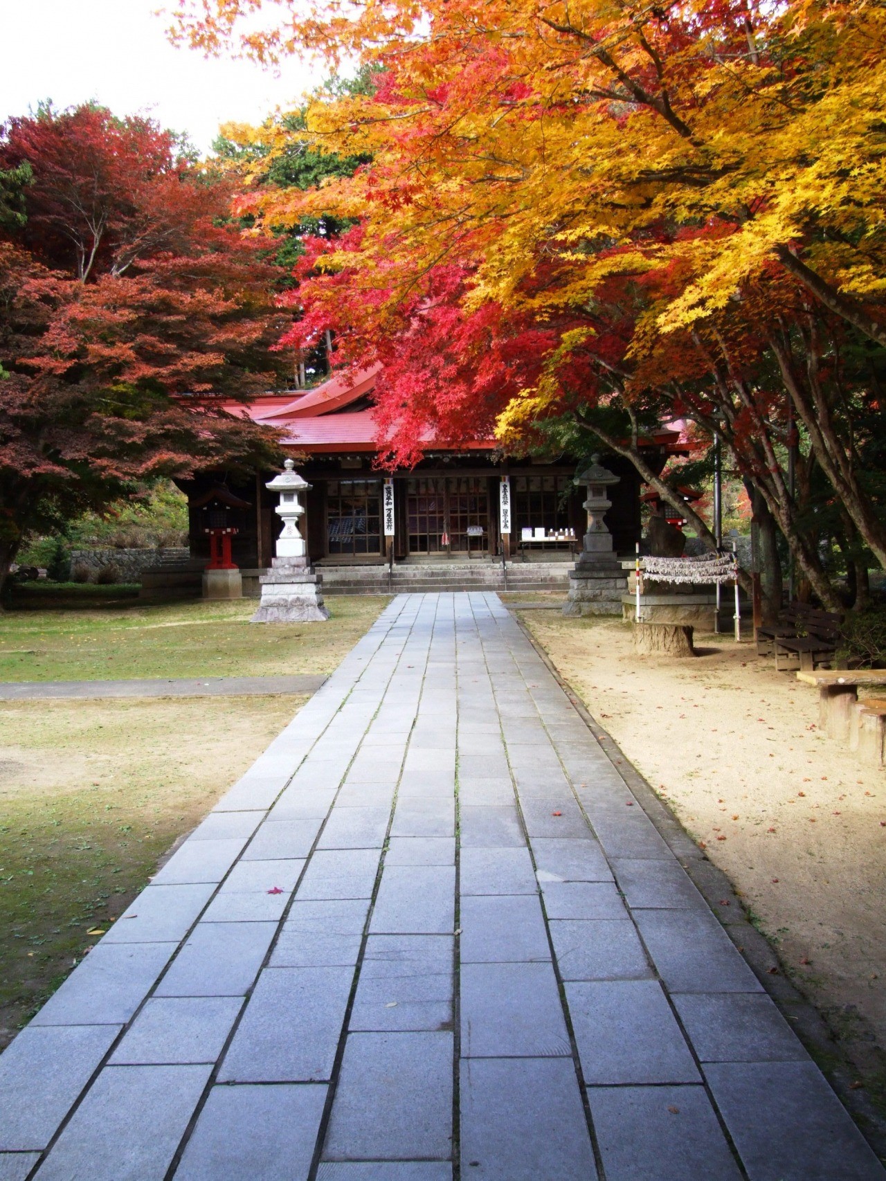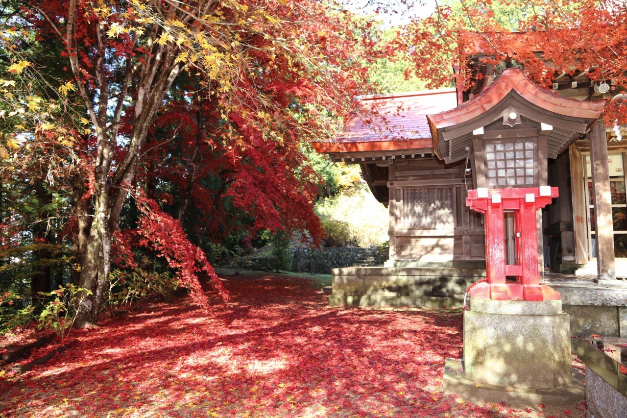 秋の例大祭では、獅子舞が奉納され、京都の嵐山から移植されたと伝わる境内のもみじが見頃になります。