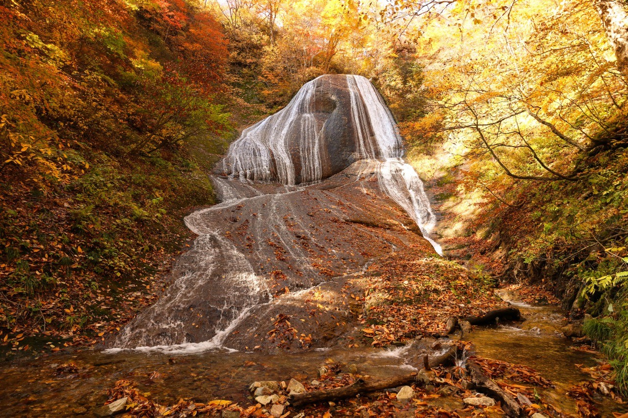みろくのたき(みろくのたき)深い緑の森の中をしばらく行くと、みろくの滝につながる小道の入り口となります。その道を足下に注意しながら進んでください。さらさらという音が聞こえてきます。滝の岩肌を洗うかのように流れる水の音です。すると突然、左手に現れるのがみろくの滝。そのあまりに神々しい姿に一瞬息が止まる思いです。四季折々の木々の色は、新緑から深緑へ。そうして大急ぎで紅葉し、やがて白い季節へと移ろい変わるのです。