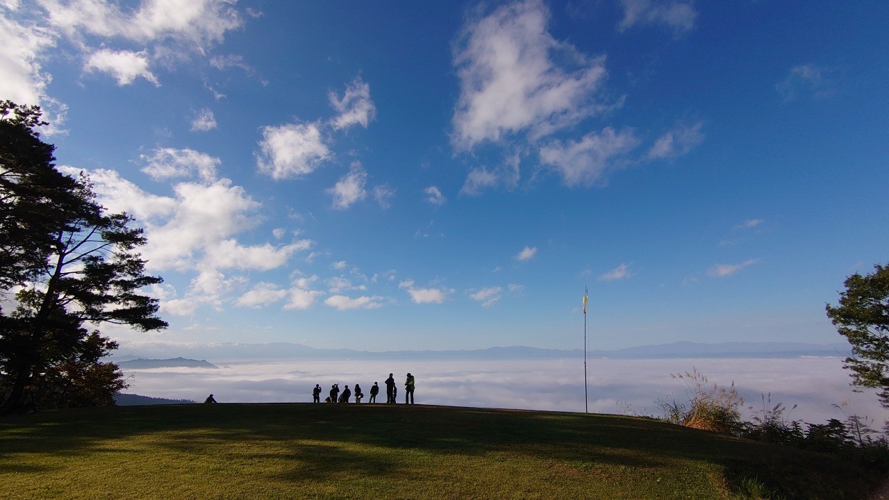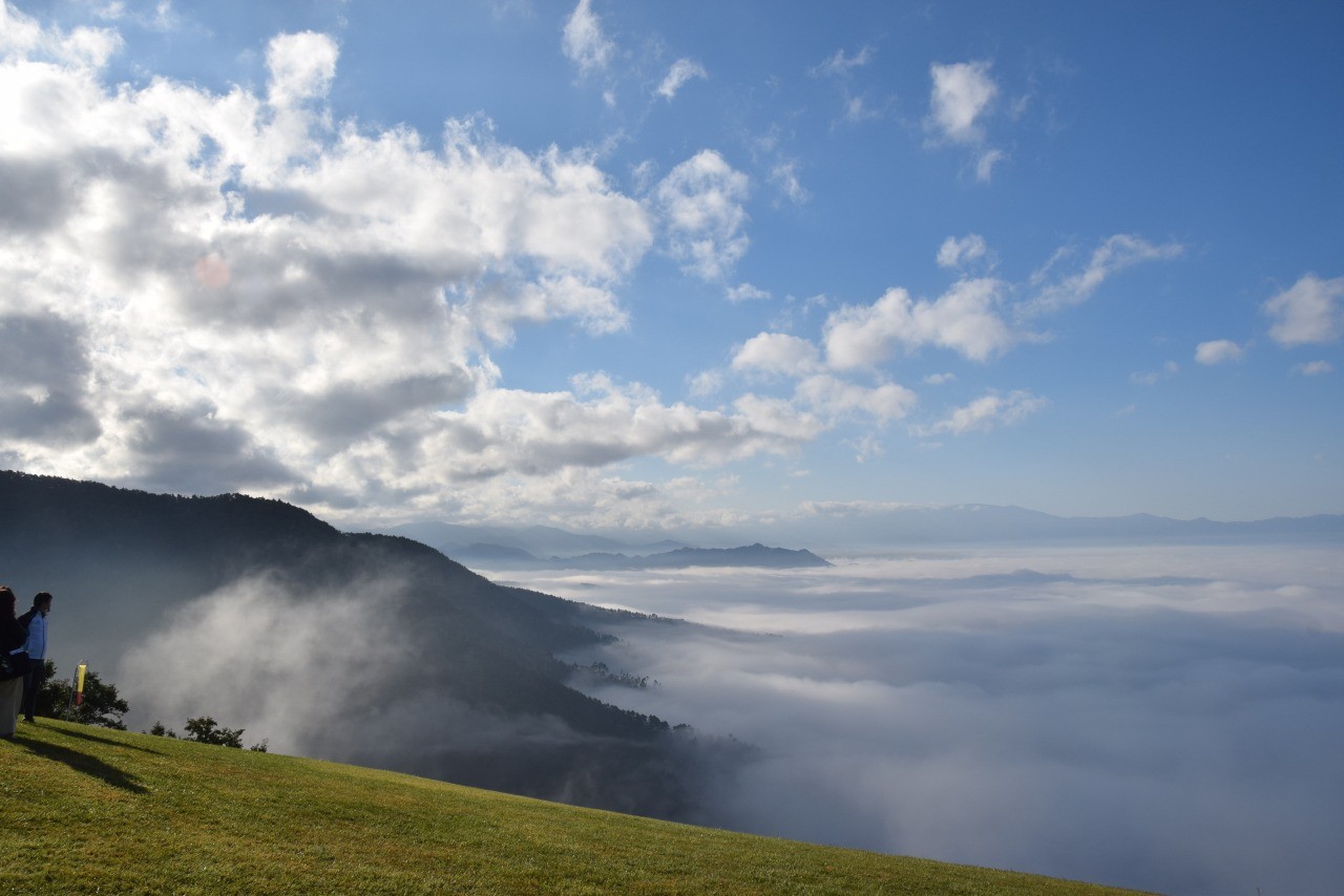 一気に目の前が開けていく景色はそれだけでも絶景ですが、秋の早朝、気象条件が合えば盆地を埋め尽くす雲海に出会うことができます。
