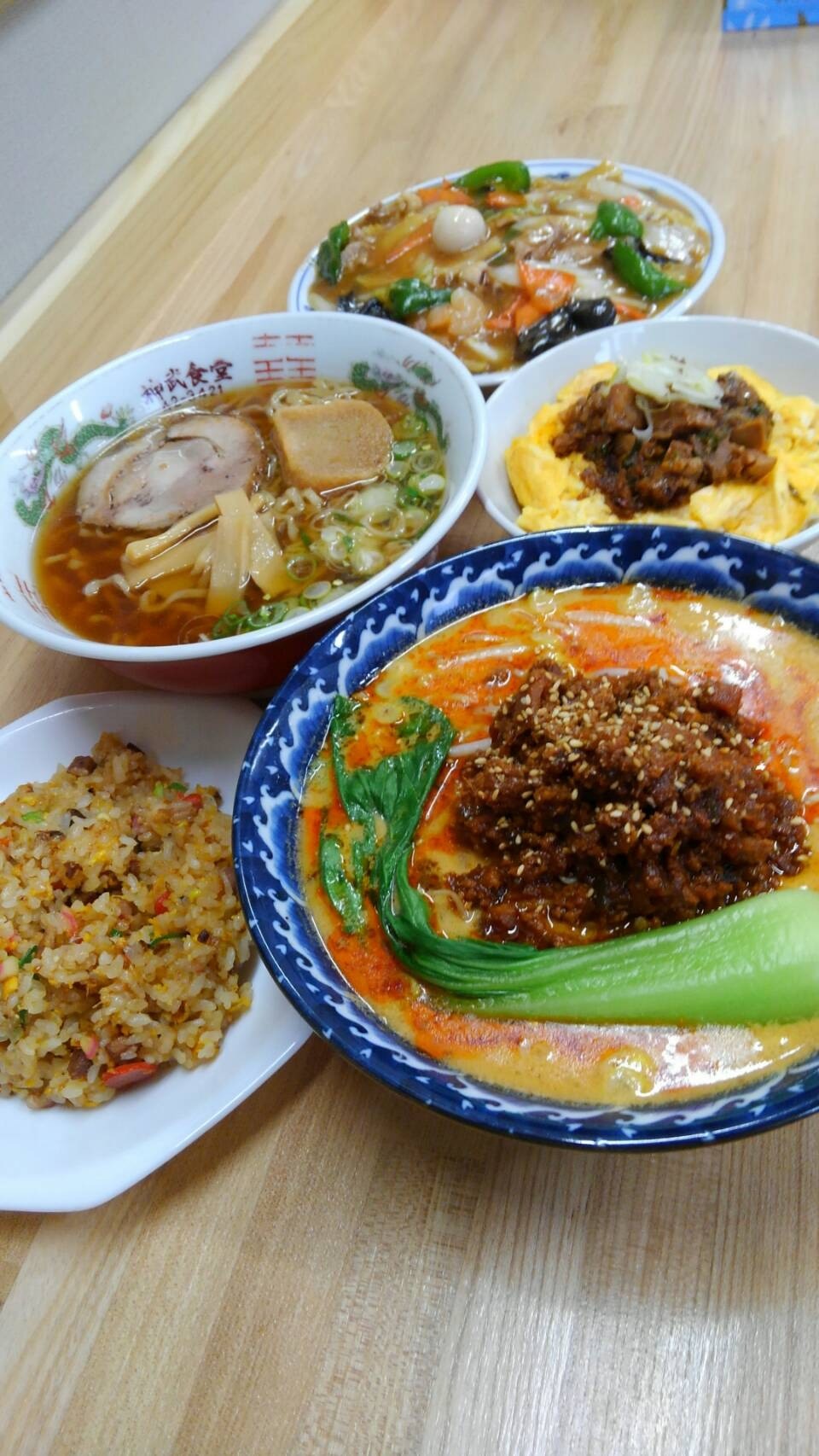 人気の担々麺や五目あんかけ焼きそばをはじめ、ラーメン、定食、丼物までボリューム満点のメニューが並ぶ。