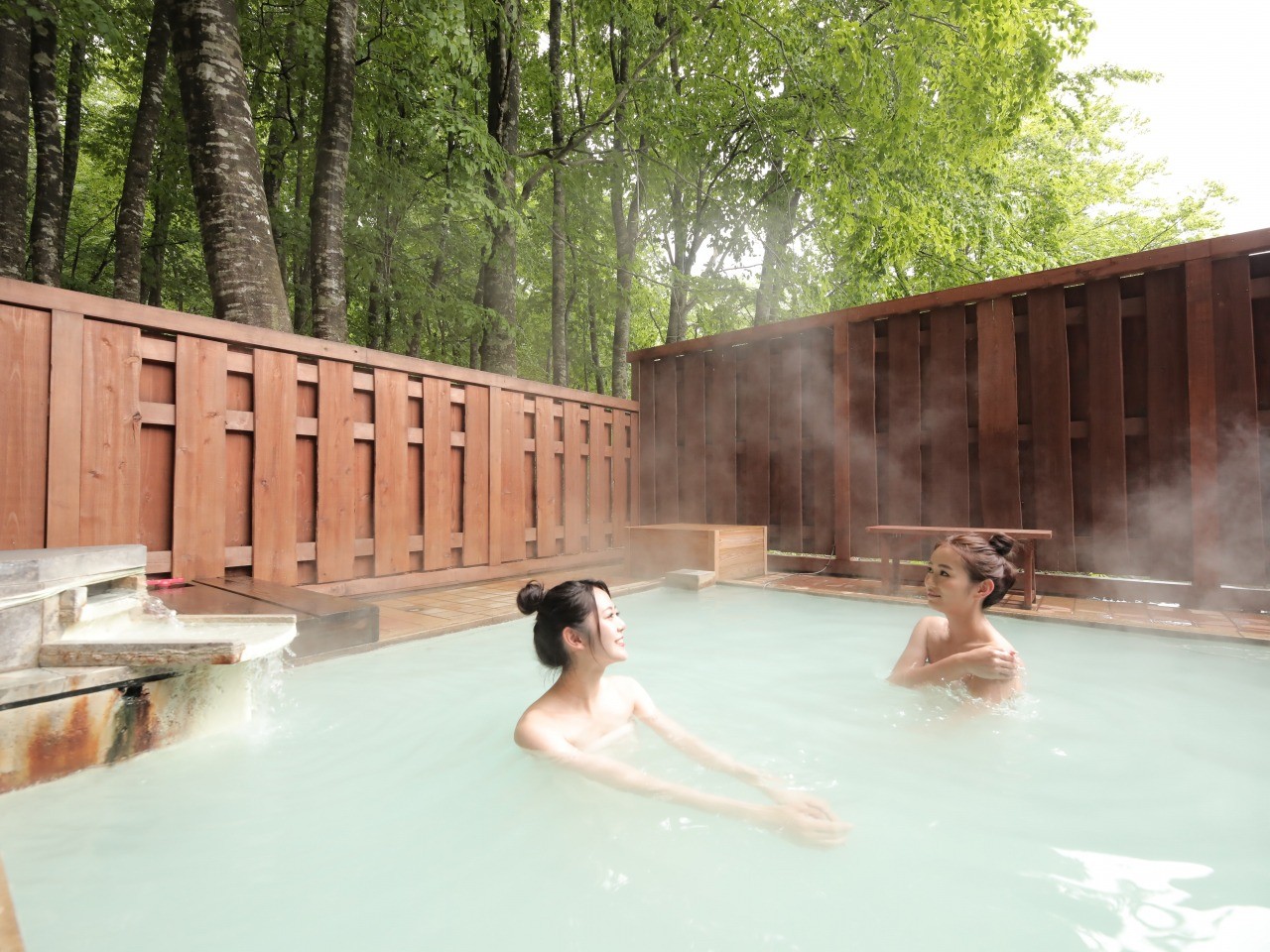 ブナの森に囲まれる露天風呂(単純硫黄泉)では、季節によって表情の変わる景色を間近でお楽しみいただけます。内風呂では、乳頭の湯(ナトリウム炭酸水素塩泉)と田沢湖高原の湯(単純硫黄泉)の2種類の源泉掛け流しの天然温泉をお楽しみいただけます。泉質、温度共に異なりますので、お体に合った温泉浴をお楽しみ下さい。