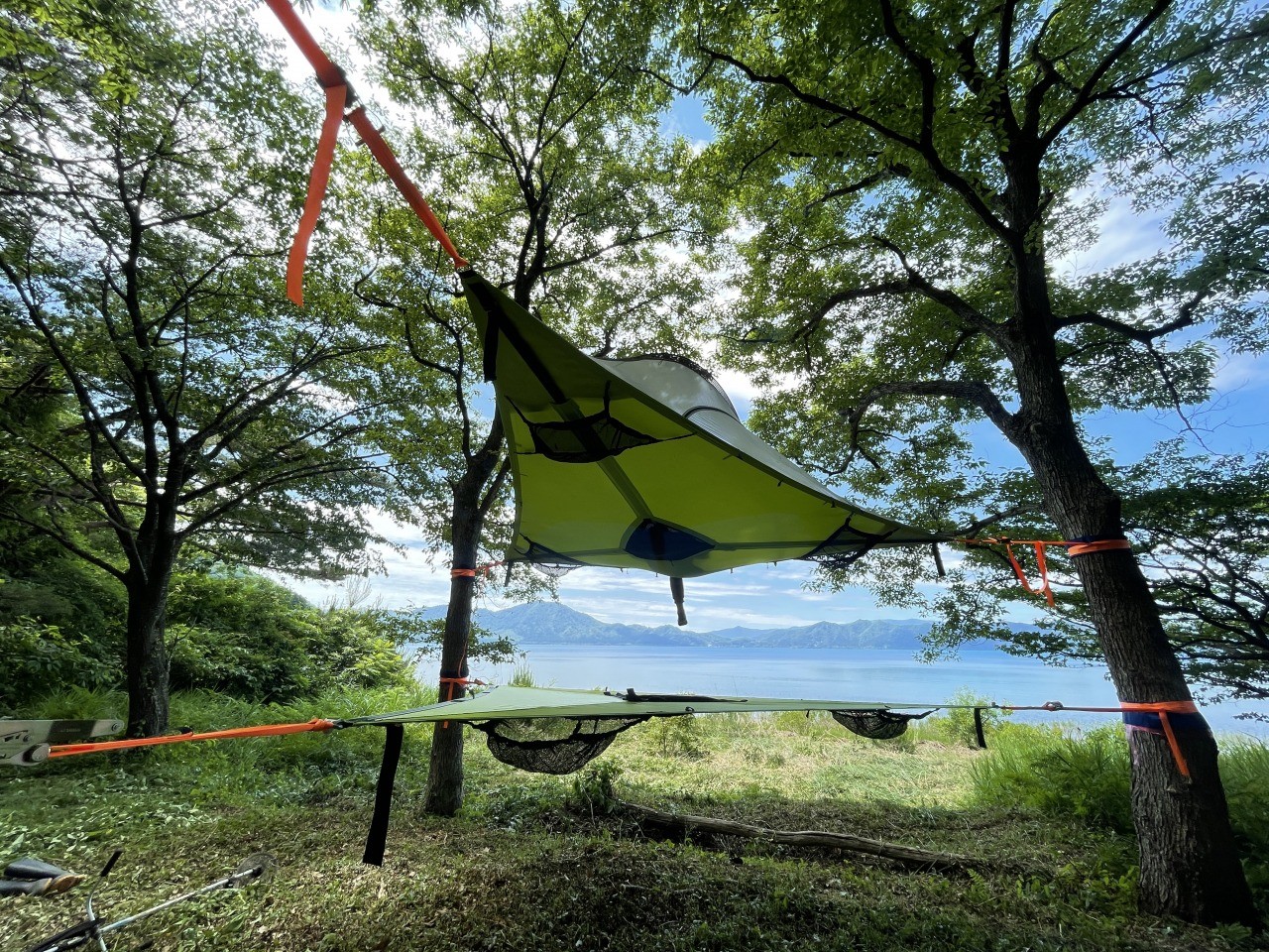 「宙に浮く感覚が楽しめる」テントサイルを使った“空泊”プランを提供します。 頑丈な木が3本あれば、その幹に括り付けて空中でゆらゆらと滞在することができます。ハンモックのような感覚が非常に心地よい! 自分一人や友人グループだけで独占できる空中テント、田沢湖では贅沢なゆったり時間を創出します。 特にサンセットやサンライズタイムの湖の色の変化を味わうのがイチオシです。 透明な水面はまさに日本のウユニ塩湖。太陽やお月様が水面に反射する神秘的な情景が見られるかも!