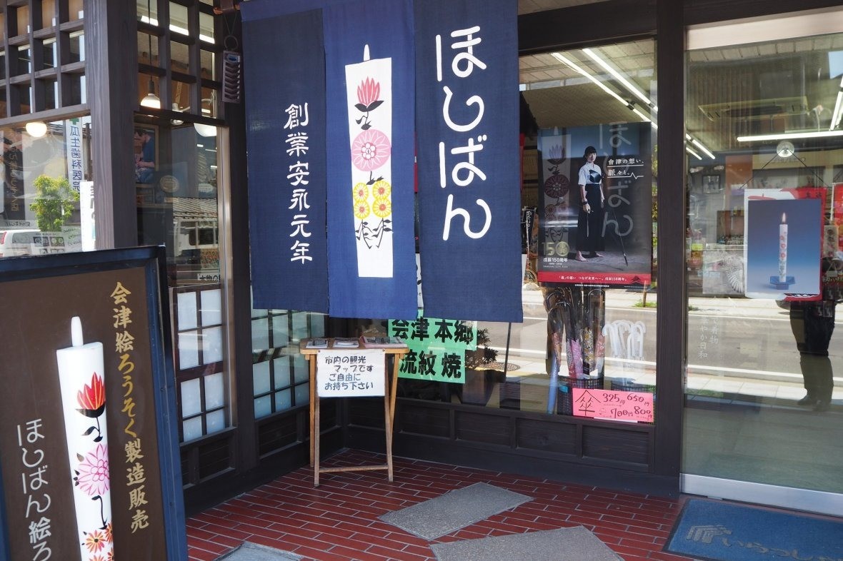ほしばんえろうそくてん(あいづこうげいたいけん)安永元年(1772年)創業の会津藩お抱え職人として働いた老舗です。鮮やかな色合いが美しい、絵ろうそくの専門店です。菊や牡丹など絵柄は手描きで、親子代々、伝統の技が現代に受け継がれてきています。店内には工房があり、絵付けの体験も可能です。(※要予約。)自分だけのオリジナルの作品を作って、記念品にしたり、お土産にも最適です。製作の工程を見学だけでもOKです。(お買上げ頂いた方に限ります)