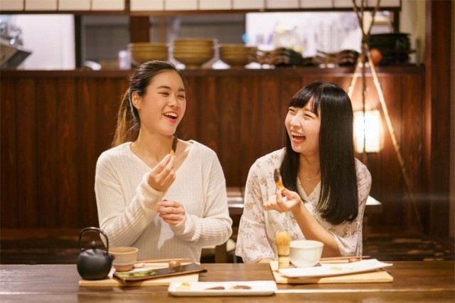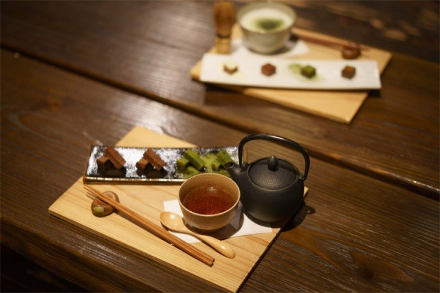 レトロな和の空間で、「お箸」でいただくスタイルもとても新鮮。テリーヌや生チョコ、そのほかのスイーツも購入できるのでお土産にぜひ。