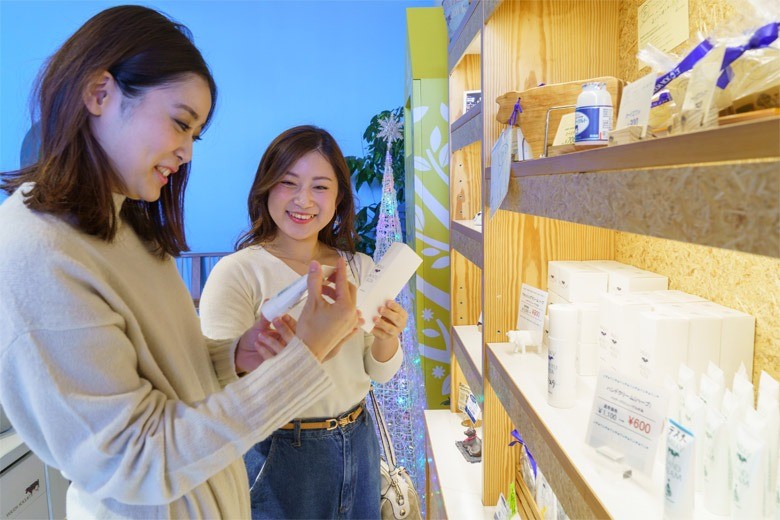 店内には濃厚なドリンクヨーグルトや発酵バターをぜいたくに使ったソフトクリームや焼き菓子、ヨーグルトに含まれる美肌成分「ホエイ」入りのハンドクリムなどがラインナップ。