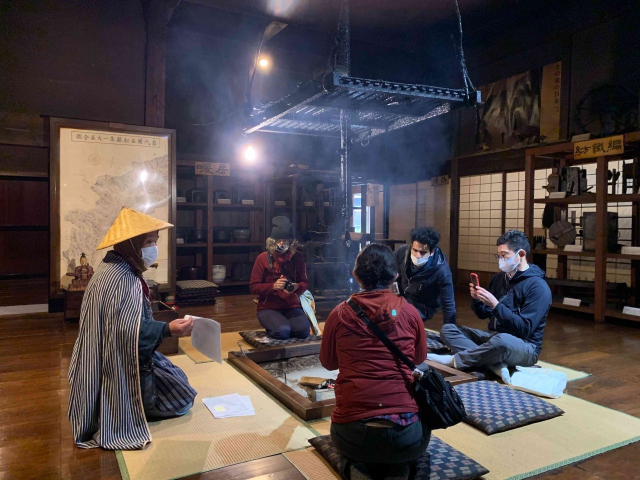しゅくばまちにもねづいていたえどぶんかすぴりっつたいけん江戸時代に参勤交代の街道として栄えていた大内宿にある町並み展示館の囲炉裏で火にあたりながら、ガイドを通して、江戸時代の庶民の生活を体験する。