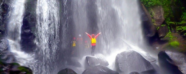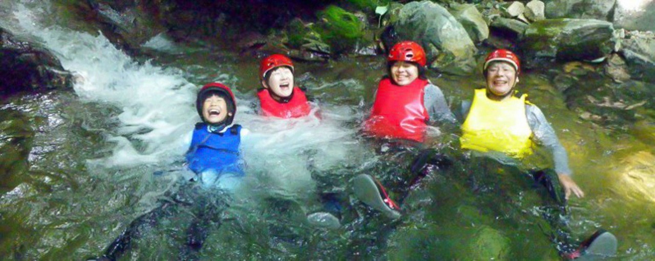 だいこうふんのみずあそび しゃわーうぉーくもくもく自然塾オリジナルアクティビティ「シャワーウォーク」はキャニオニングとシャワークライミングを合わせたようなウォーターアクティビティ。激流を遡ったり、流れたり、飛び込んだり。 冷たーい水で思いっきり遊べば、気分爽快。夏休みの思い出は、シャワーウォークで決まり。