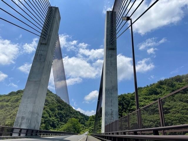 さんのへぼうきょうおおはし三戸望郷大橋は、橋の長さ400メートル(中央径間200メートル)の3径間連続エクストラドーズド橋で、中央径間はPCエクストラドーズド工法による橋では世界最大級を誇ります。