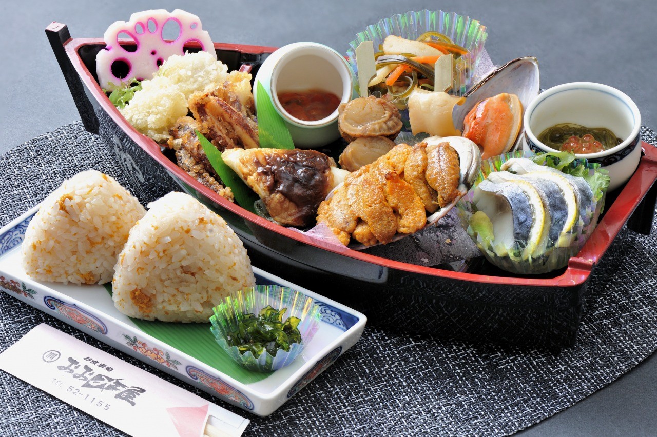 「こたつ列車」の車内では、「大漁舟唄御膳」、「あわび弁当」といったお弁当や、スイーツを味わうことも可能(要予約)。