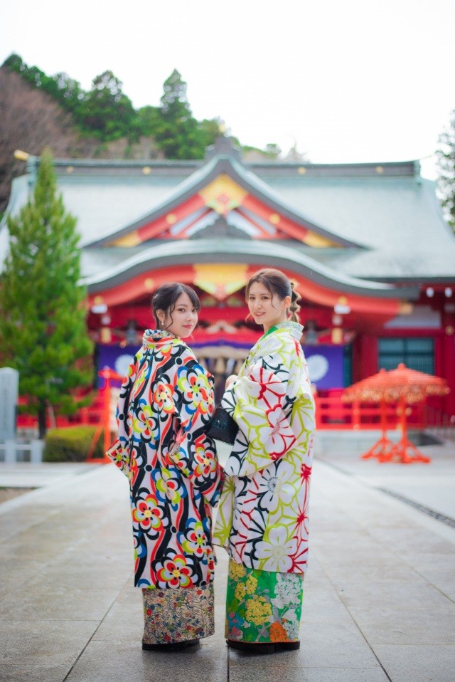 ① レンタル着物店にて着物を着用し、美しく着飾ります。